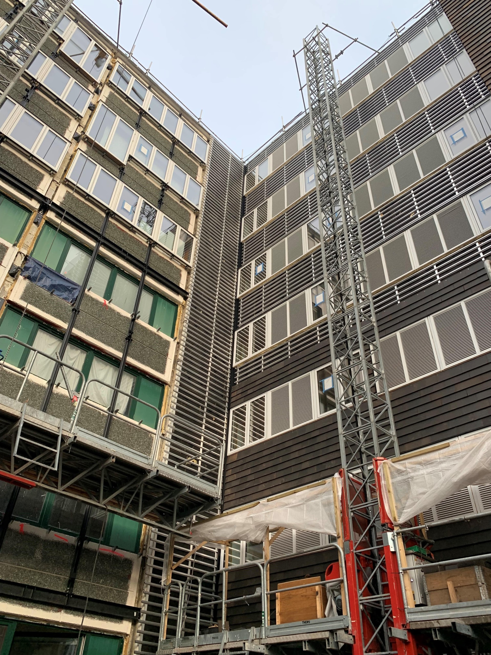 - Oft besteht bei älteren Gebäuden ein erhöhter Bedarf an besserer Dämmung – so auch bei Islandshus. Daher wurde die alte Vormauer entfernt, um eine neue, gedämmte Fassade zu errichten. Nach der Entfernung der Vormauer besteht allerdings das Risiko, dass die Oberfläche nicht mehr vollständig eben ist. Unser Hinterbau- und Aufhängungssystem gleicht solche Unebenheiten aus und sorgt für eine optisch perfekte Fassade.
